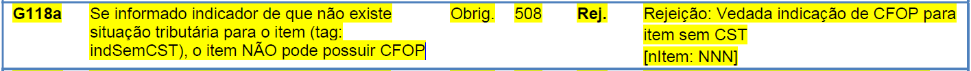 Quando for emitida uma NF3e (modelo 66), e for informado o indicador de não existência da situação tributária para o item (tag: indSemCST), e possuir indicador de CFOP, será retornada a rejeição “Rejeição 508: Vedada indicação de CFOP para item sem CST.“