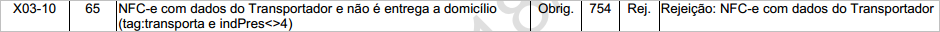 Quando for emitida uma NFC-e com dados do Transportador (Campo: transporta – ID: X03) e o Indicador de presença do comprador (Campo: indPres – ID: B25b) for diferente de “4 – NFC-e em operação com entrega a domicílio”, será retornado a rejeição “754 – NFC-e com dados do Transportador”.