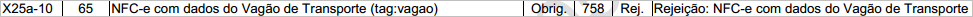 Quando for emitida uma NFC-e com dados do Vagão de Transporte (Campo: vagao – ID: X25a), será retornado a rejeição “758 – NFC-e com dados do Vagão de Transporte”.