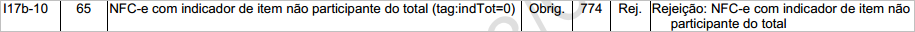 Quando for emitida uma NFC-e e o Indica se valor do Item (Campo: indTot – ID: I17b) for igual à “0 – Valor do item (vProd) não compõe o valor total da NF-e”, será retornado a rejeição “774 – NFC-e com indicador de item não participante do total”.