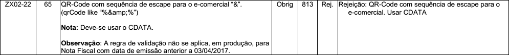 Quando for emitida uma NFC-e e no QR-Code for utilizado a sequência de escape (&) para substituir o e-comercial (&), será retornado a rejeição “813 – QR-Code com sequência de escape para o e-comercial. Usar CDATA”.